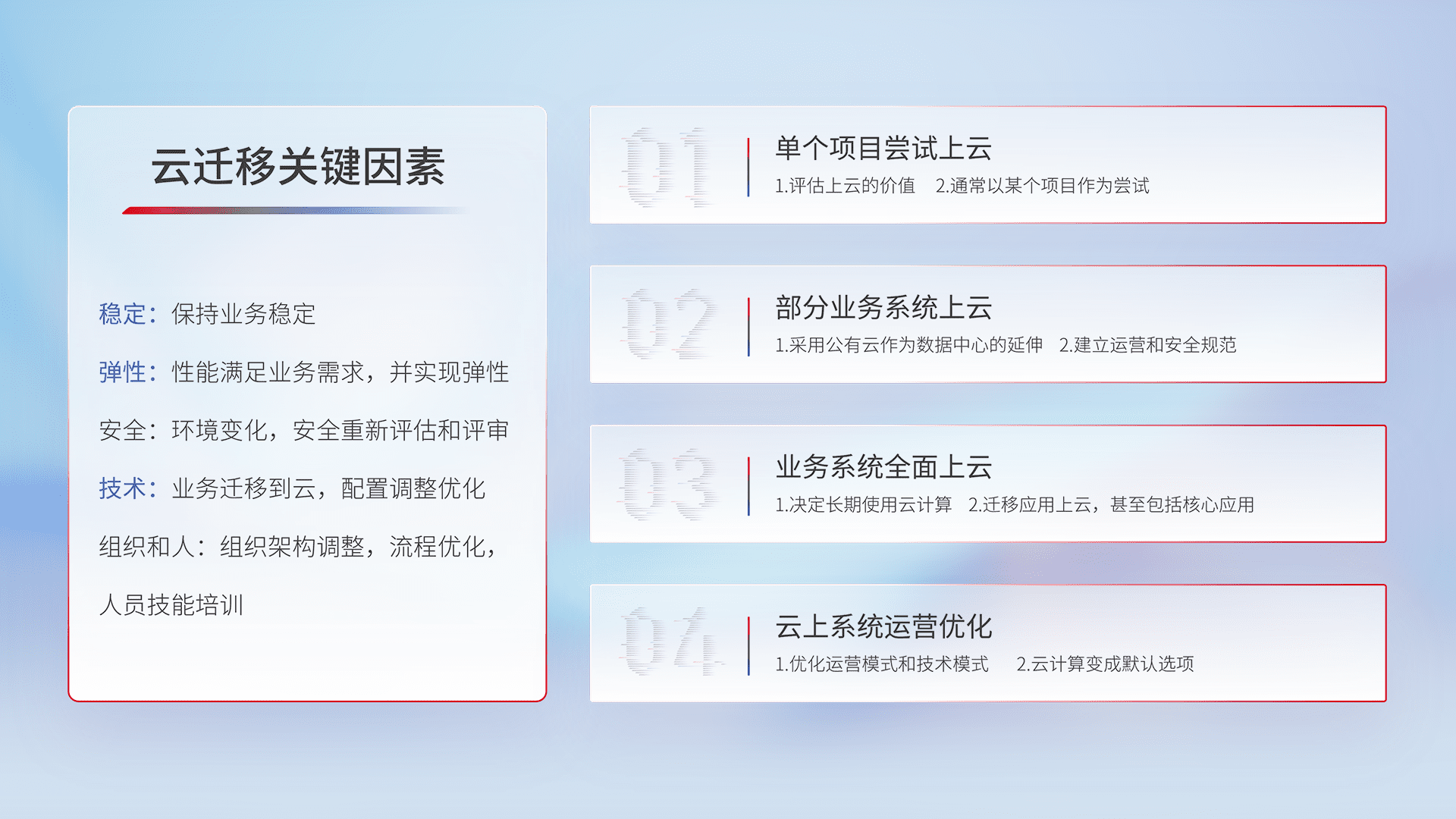 结合实际业务,,从规划设计、、云平台选型、、云原生改造、、、数据迁移、、集成交付,,迁移全过程为客户识别最佳上云路径,,,做好风险识别管理,,设计网络架构、、、身份权限、、安全审计合规、、操作审计、、、日志审计、、、、监控告警策略、、多站点容灾设计等,,对云上基础设施进行整体规划,,,,提升IT治理水平,,,以满足弹性、、、、高可用、、、、高性能的需求。。。。