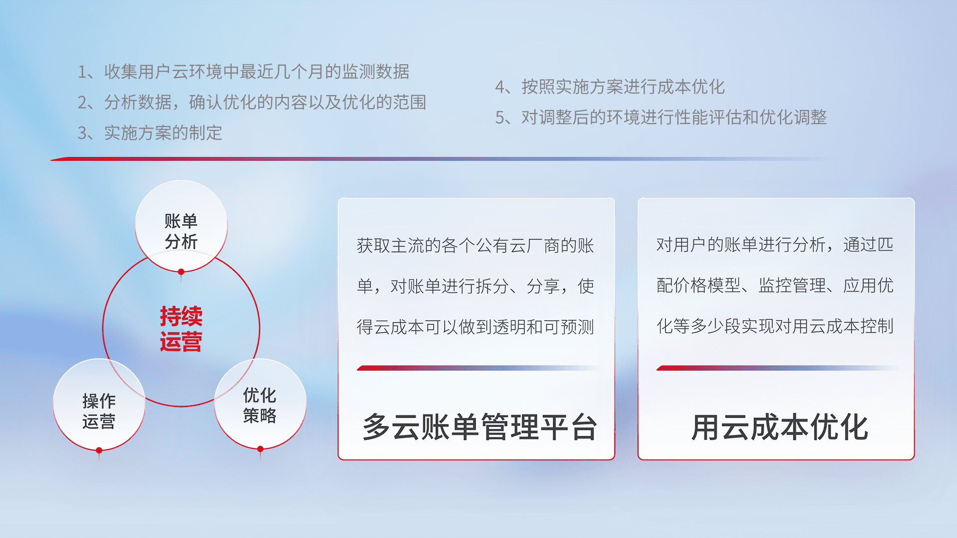 通过多云纳管,,以统一的资源数据模型把客户的云资源进行抽象和封装,,进而实现对多云资源的统一操作,,,,保障云资源管理的可靠性、、、、稳定性与可用性。。。。量身定制化运维内容,,,,配置、、、、开发运维、、、补丁管理、、备份、、、、监控、、、、认证和访问管理、、审计和日常巡检等,,保障在用云过程中的可靠度,,,稳定度以及高可用率。。。。