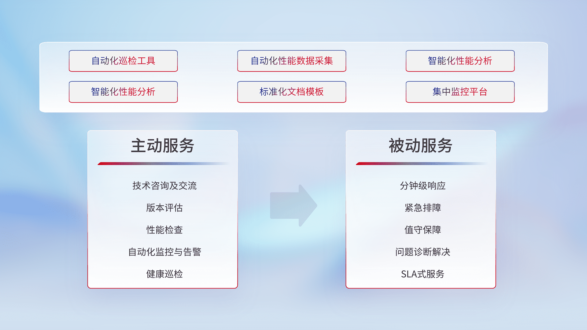 智能化工具和标准化文档,,,保障服务质量,,,,提供主动服务(包含技术咨询、、、、版本评估、、、性能检查、、、自动化监控与告警、、、健康巡检)和被动服务包含(分钟级响应、、紧急排障、、值守保障、、、、问题诊断解决、、、SLA服务)。。
